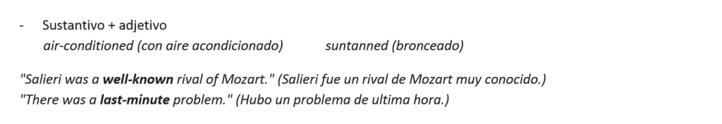 Las dos palabras de la combinación se pueden escribir unidas por un guión, unidas en una sola palabra o separadas: (*) El lenguaje inglés tiene gran facilidad para formar palabras con un significado propio a partir de palabras que tienen cada una por separado un significado independiente. Bedroom (Bed+Room) / Dormitorio Postcard (Post+Card) / Tarjeta postal Breakfast (Break+Fast) / Desayuno Washing-machine / Lavadora