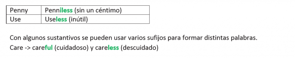 Con el sufijo -ing (que forma el gerundio) se obtiene un sustantivo que expresa la acción y el efecto del verbo. To Write (Escribir) Writing (La escritura) To eat (Comer) Eating (El comer) To dance (Bailar) Dancing (El baile)